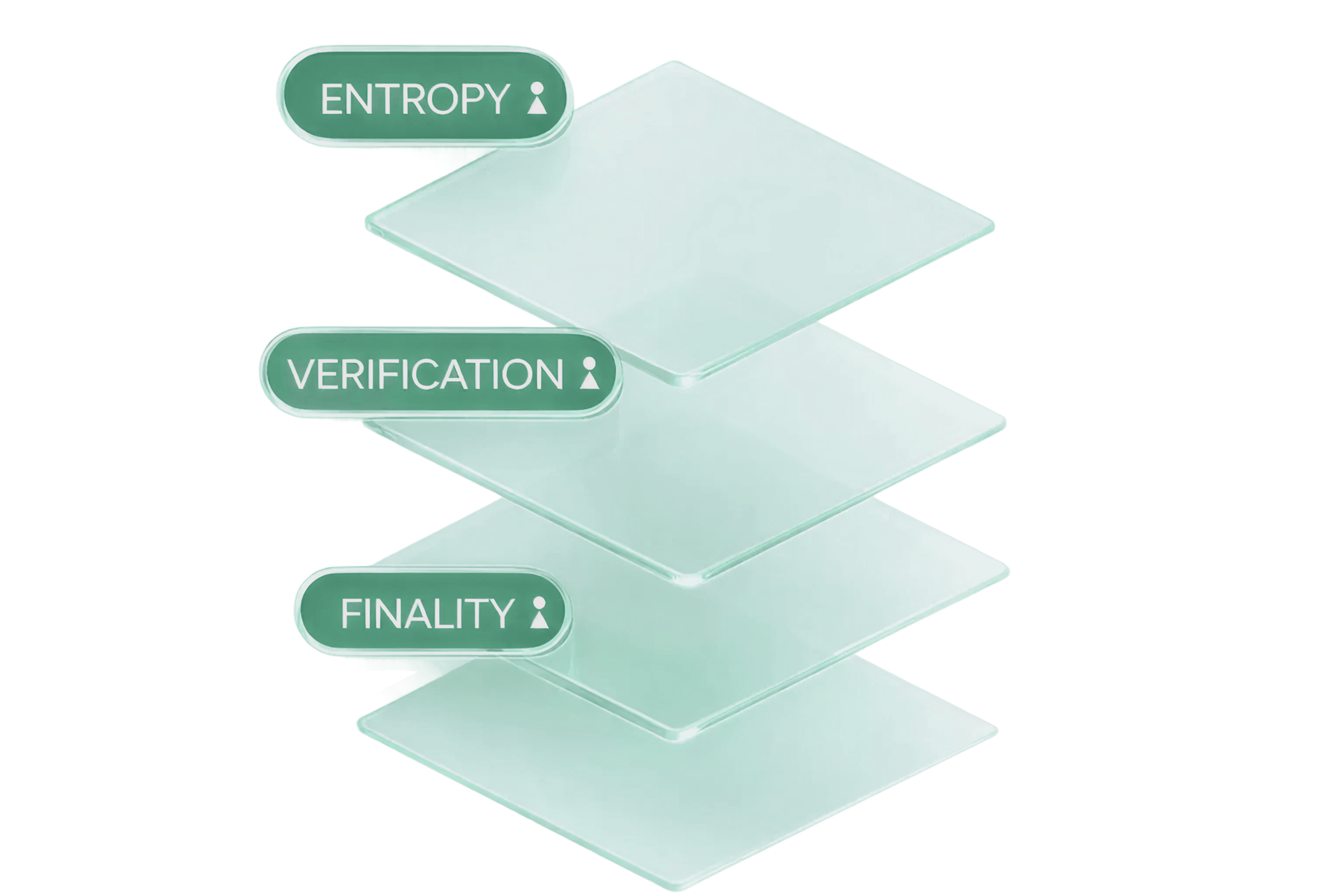 Only when a physical event is cryptographically proven as real and the actors and assets involved are contextually verified for identity, jurisdiction, compliance, solvency, and ownership can the event advance to final state.
